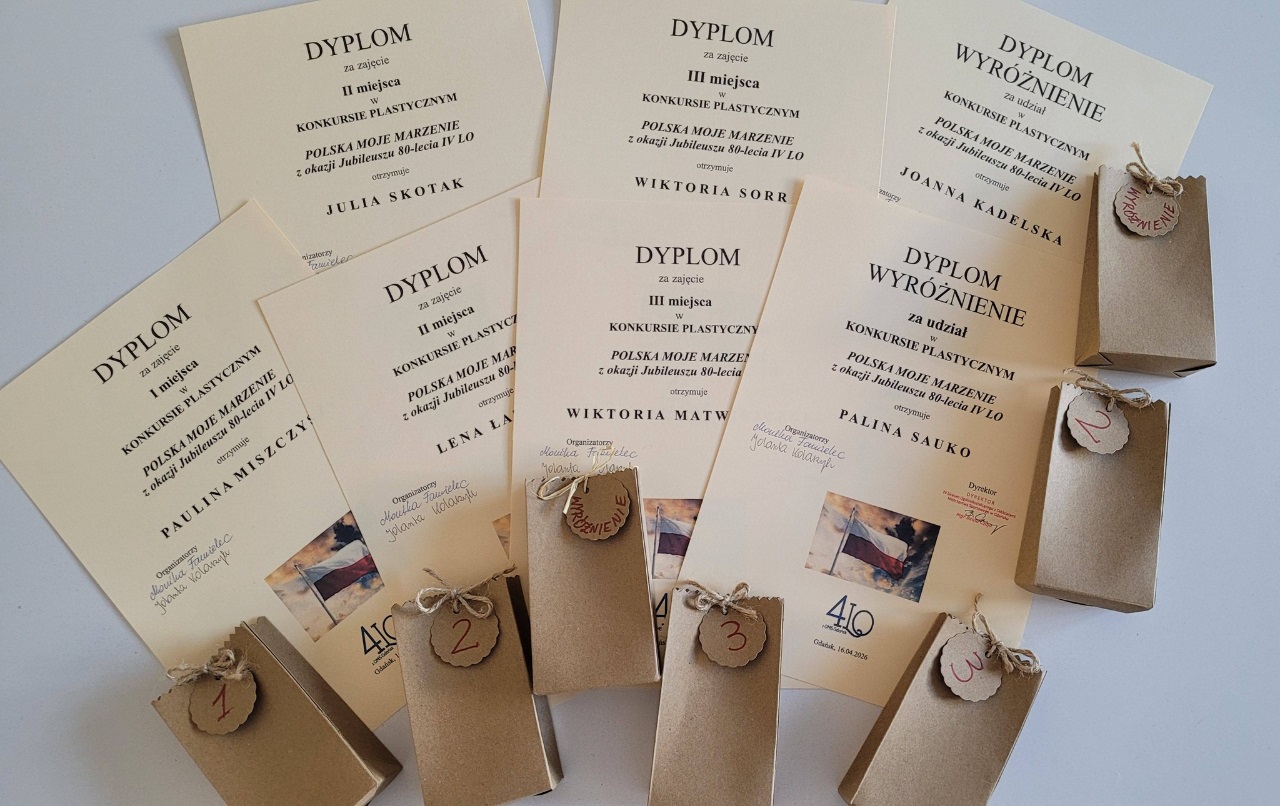Konkurs plastyczny POLSKA MOJE MARZENIE z okazji Jubileuszu 80-lecia IV LO cieszył się dużym zainteresowaniem uczniów, a wykonane prace można podziwiać w holu szkoły.