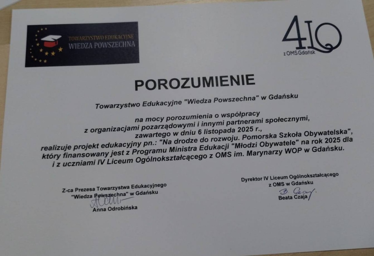 Z radością informujemy, że oficjalnie Pani Dyrektor Beata Czaja i z-ca prezesa Towarzystwa Edukacyjnego "Wiedza Powszechna" w Gdańsku Pani Anna Odrobińska, zawarły porozumienie o współpracy przy realizacji projektu edukacyjnego pt. "Na drodze do rozwoju. Pomorska Szkoła Obywatelska", finansowanego przez Ministra Edukacji Narodowej.