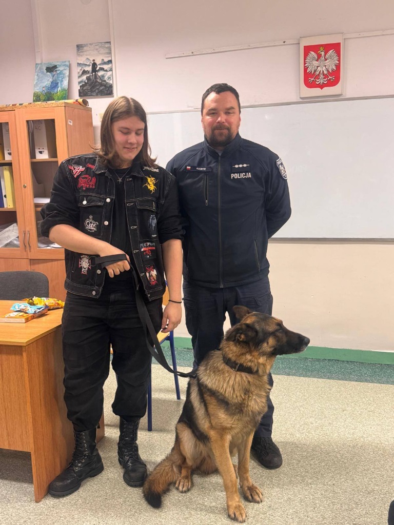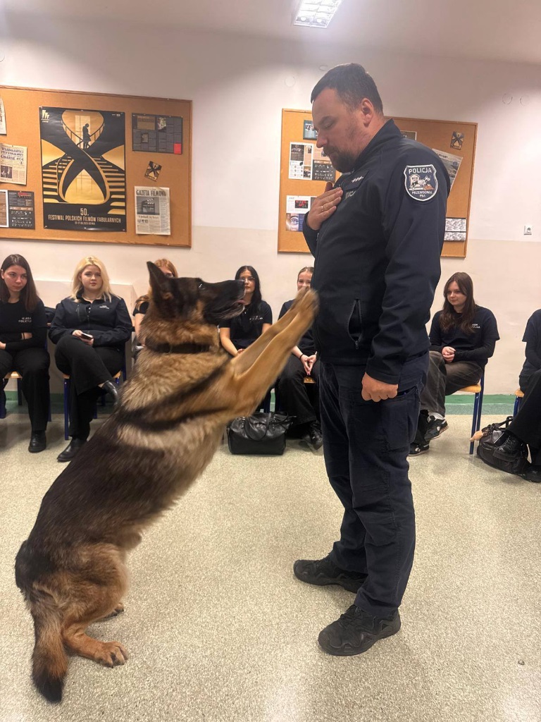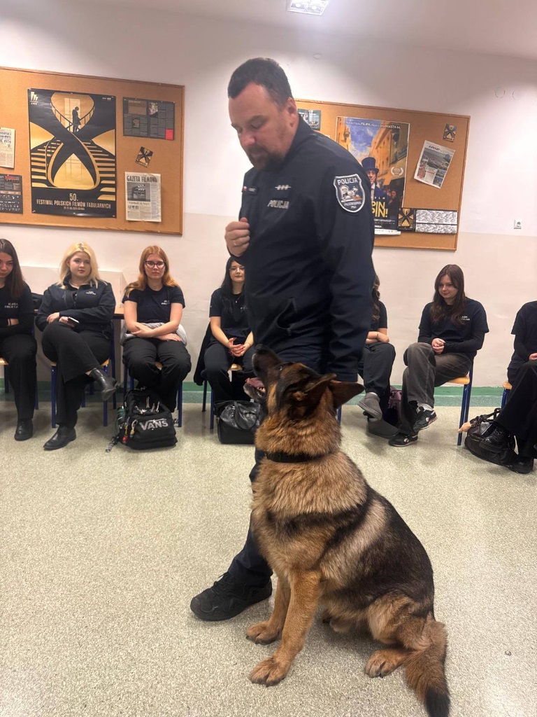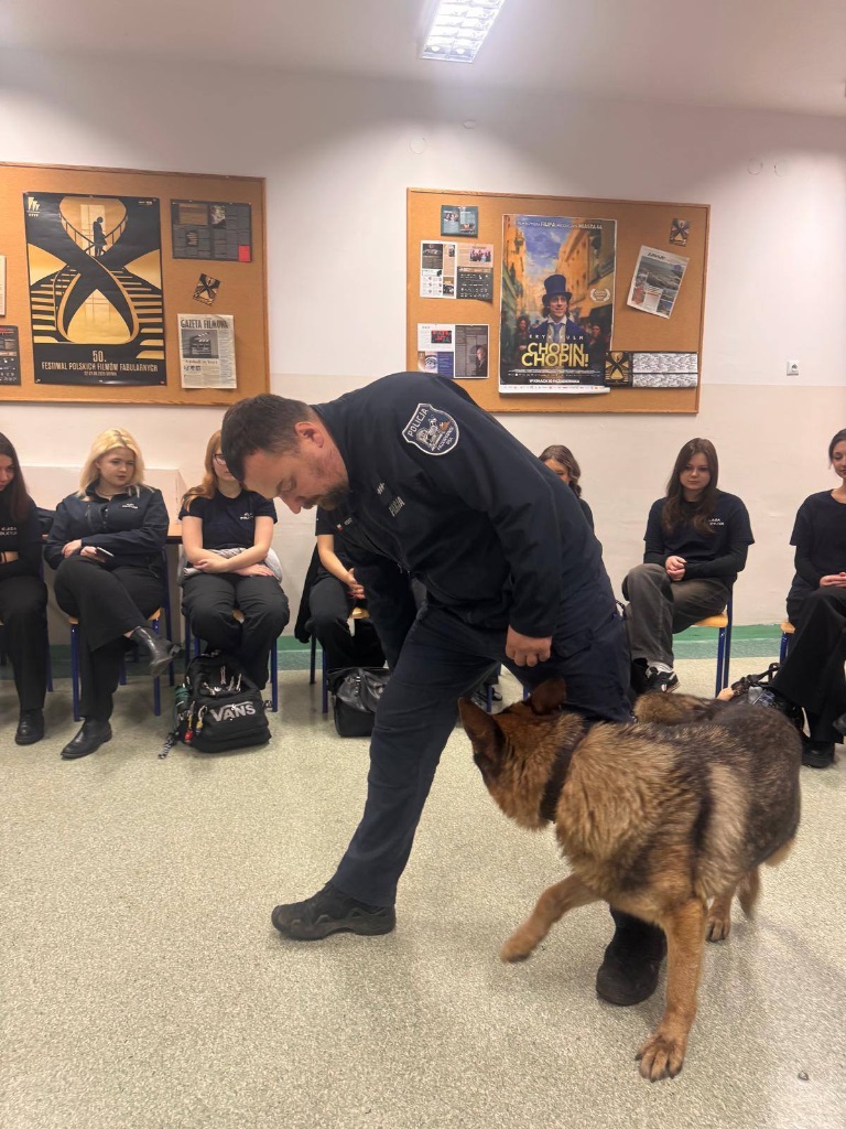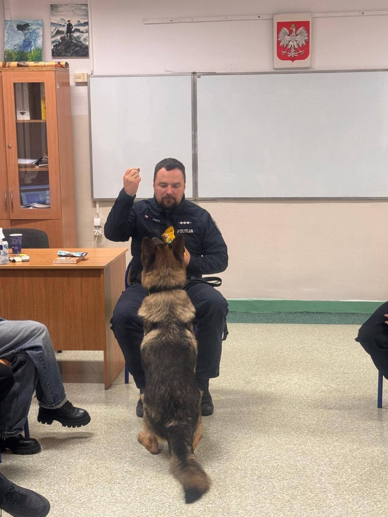 Funkcjonariusz opowiedział uczniom o specyfice swojej pracy oraz o codziennej służbie z psem policyjnym. Wyjaśnił, jakie umiejętności posiada Mentos, jak wygląda jego szkolenie oraz w jakich sytuacjach najczęściej bierze udział. Spotkanie było okazją do poznania pracy przewodnika psa od praktycznej strony oraz zobaczenia, jak ważną rolę pełnią psy w działaniach policji.