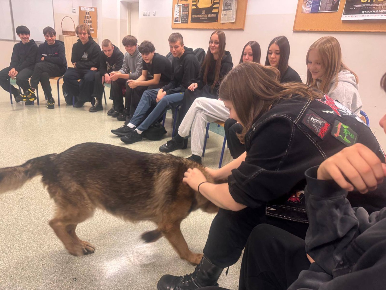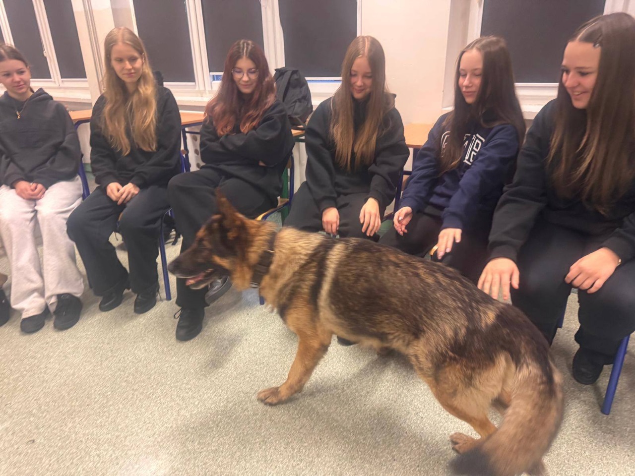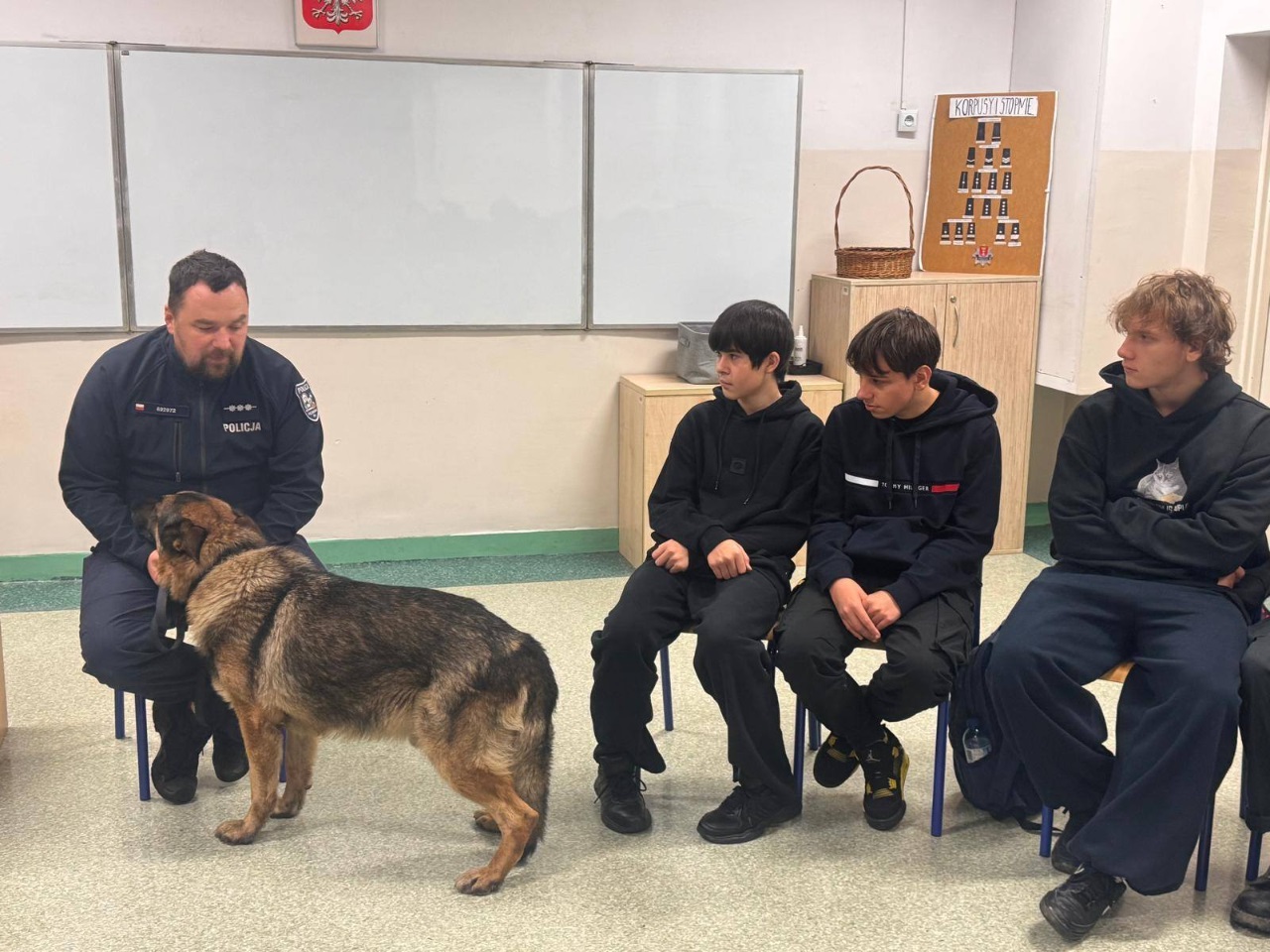 Funkcjonariusz opowiedział uczniom o specyfice swojej pracy oraz o codziennej służbie z psem policyjnym. Wyjaśnił, jakie umiejętności posiada Mentos, jak wygląda jego szkolenie oraz w jakich sytuacjach najczęściej bierze udział. Spotkanie było okazją do poznania pracy przewodnika psa od praktycznej strony oraz zobaczenia, jak ważną rolę pełnią psy w działaniach policji.