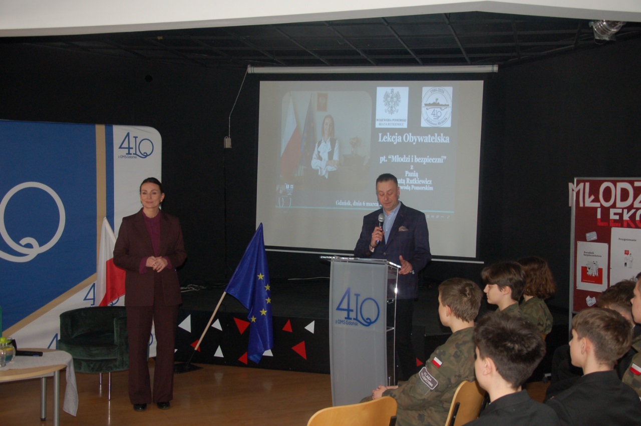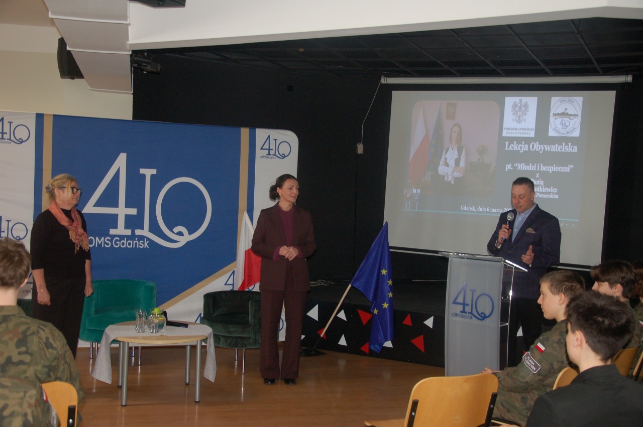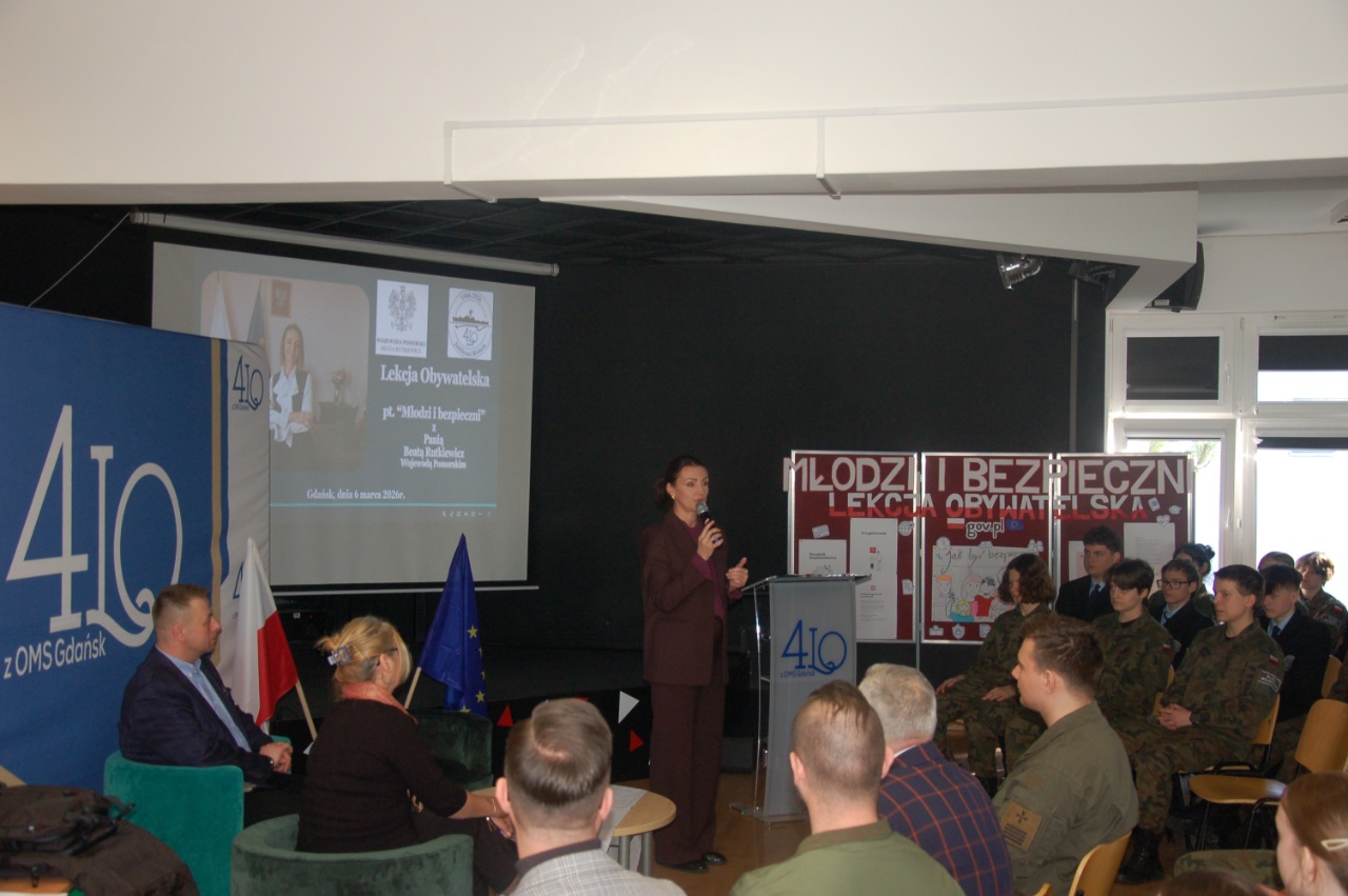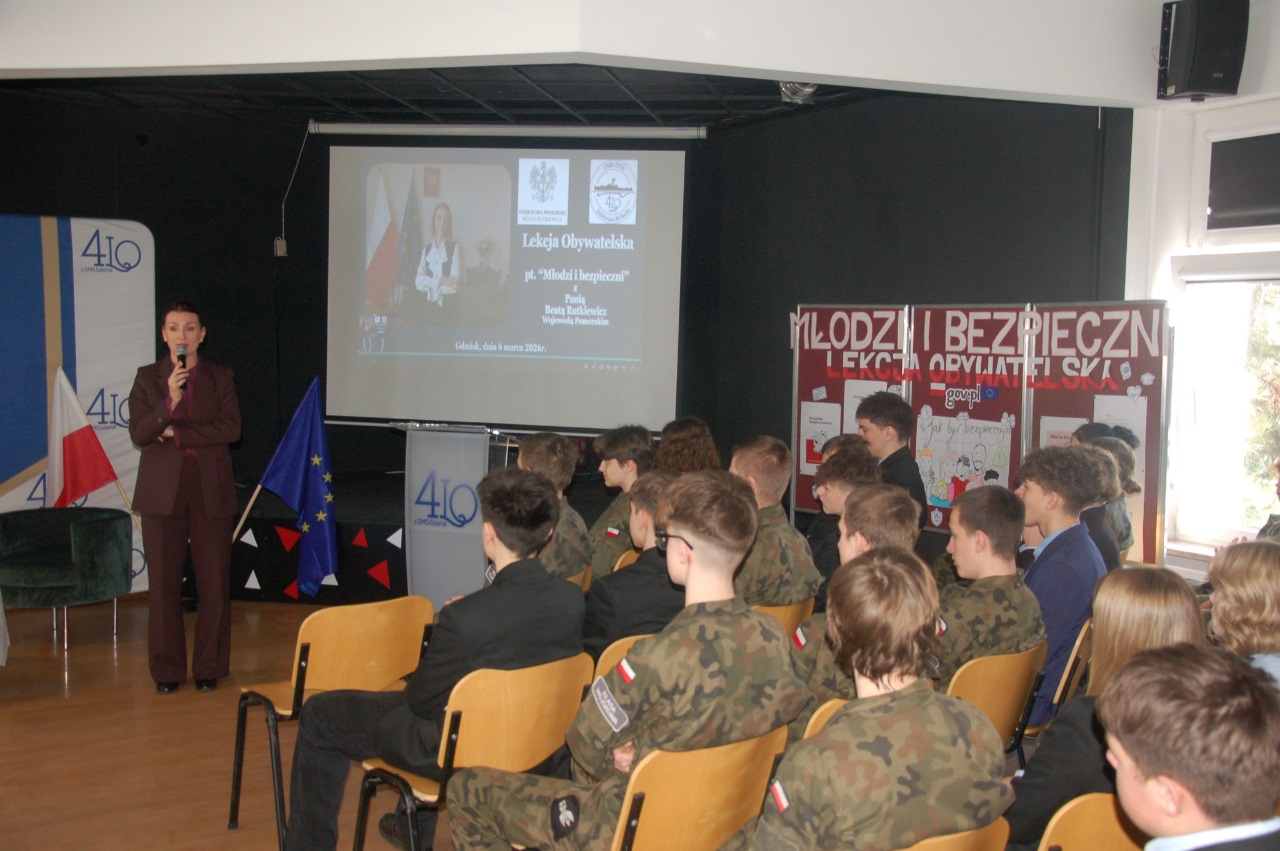 W 4LOzOMS / Centrum Edukacji Bezpieczeństwa, w dniu 6 marca 2026r. odbyła się lekcja obywatelska z udziałem Pani Beaty Rutkiewicz Wojewody Pomorskiej. To wyjątkowe spotkanie edukacyjne, które pozwoliło uczniom poznać w praktyce funkcjonowanie administracji rządowej oraz znaczenie bezpieczeństwa państwa i obywateli.
