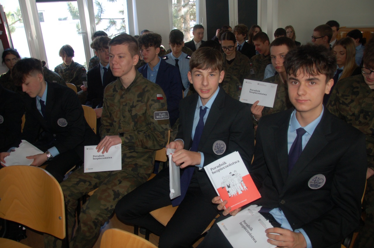 Istotnym elementem lekcji była rozmowa o odpowiedzialności obywatelskiej młodych ludzi, roli wiedzy o bezpieczeństwie oraz znaczeniu świadomego uczestnictwa w życiu publicznym. Punktem wyjścia do dyskusji był także „Poradnik bezpieczeństwa”, który uczniowie otrzymali wcześniej. Na jego podstawie analizowano m.in. sposoby reagowania w sytuacjach kryzysowych, znaczenie przygotowania społeczeństwa na zagrożenia oraz rolę edukacji w budowaniu odporności państwa.
