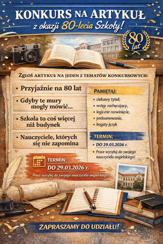 Z okazji 80-lecia naszej szkoły zapraszamy Was do udziału w konkursie na artykuł wspomnieniowy w języku angielskim.