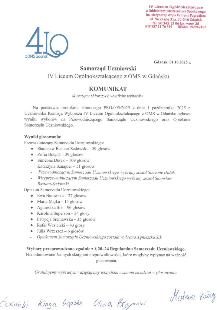 Uczniowska Komisja Wyborcza ogłosza oficjalne wyniki głosowania z dnia 01.10.2025 r.
